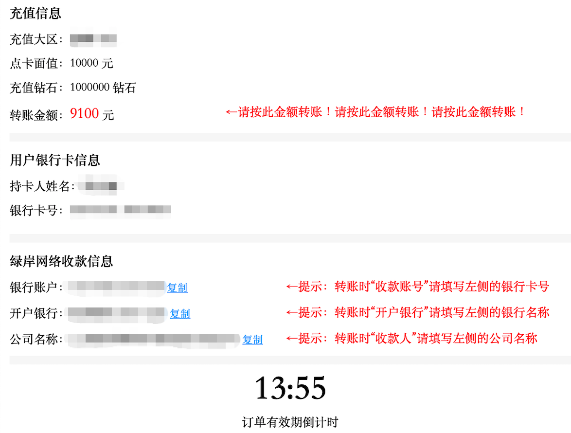功能介绍:通过个人银行卡向指定银行账号转账进行充值,首先在《大额转账充值》页面登录游戏账号,然后填写充值订单,在规定时间内按订单信息给指定银行账号转账,系统核验订单信息和实际转账一致后发放钻石。友情提示:转账所用的银行卡和登录的游戏账号实名信息必须一致,否则无法充值。