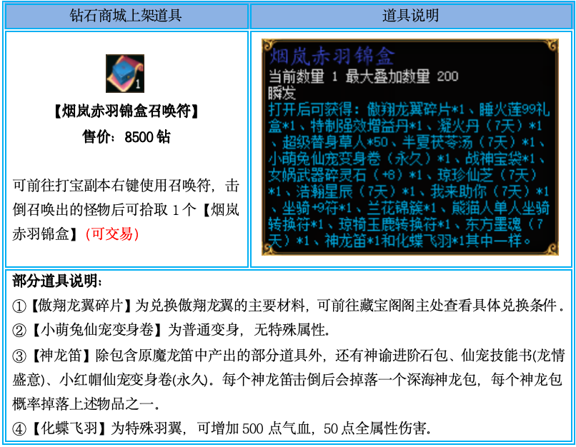 2、【烟岚赤羽锦盒召唤符】仅限钻石商城购买,通过摆摊购买、互相交易、邮件领取、拍卖购买等非钻石商城购买方式获得的,均不计算在活动内;