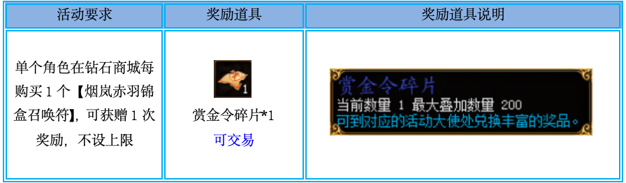 2、活动期间,单个角色在钻石商城每购买1个【烟岚赤羽锦盒召唤符】,可获得1个“赏金令碎片”,不设上限。