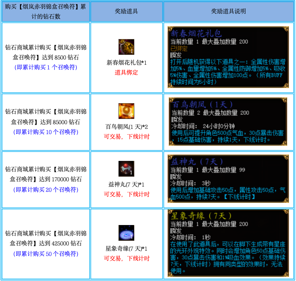 活动期间,单个角色在钻石商城累计购买【烟岚赤羽锦盒召唤符】达到以下指定要求可获得活动奖励,但每档奖励只能获得1次:
