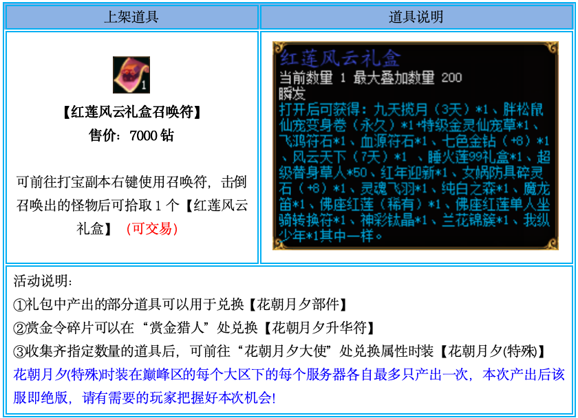 活动期间,钻石商城限时上架【红莲风云礼盒召唤符】,有需要的玩家可以前往购买,活动结束后即下架!