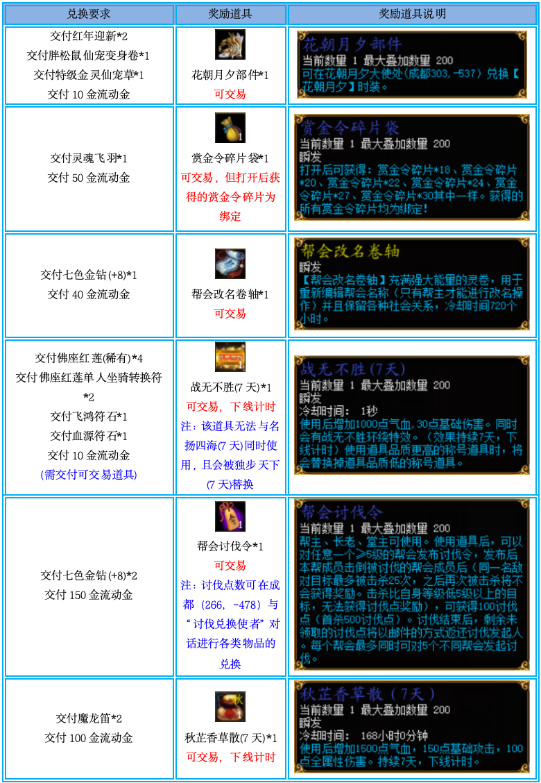 活动期间,可在npc“藏宝阁阁主”处兑换以下道具: