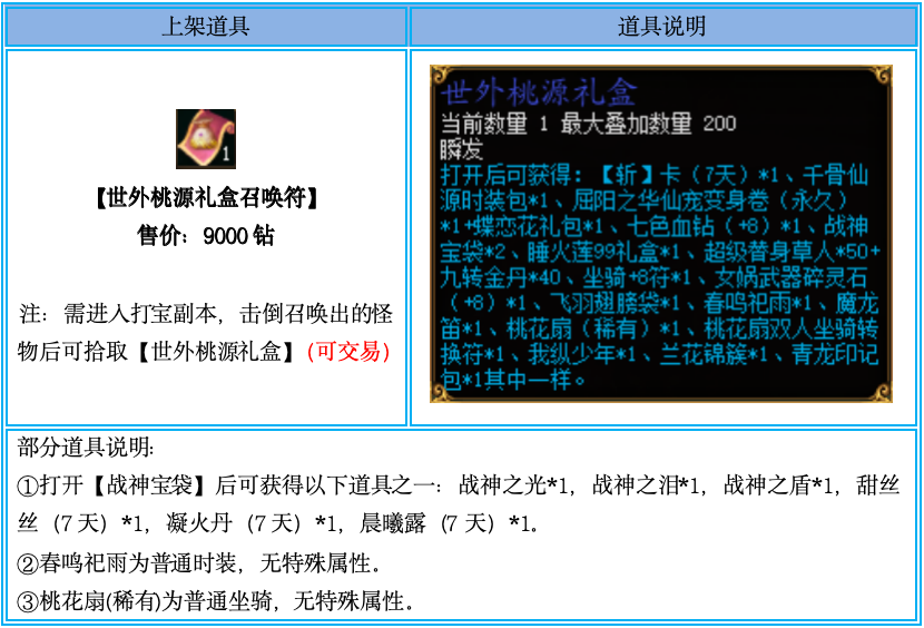 1、【世外桃源礼盒召唤符】仅限钻石商城购买,通过摆摊购买、互相交易、邮件领取、拍卖购买等非钻石商城购买方式获得的,不计算在活动内;
