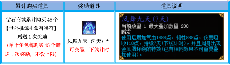 2、本活动单个角色可重复进行参与,例如角色A在钻石商城购买了90个【世外桃源礼盒召唤符】,则活动结束后可获得2个“凤舞九天(7天)”的奖励;